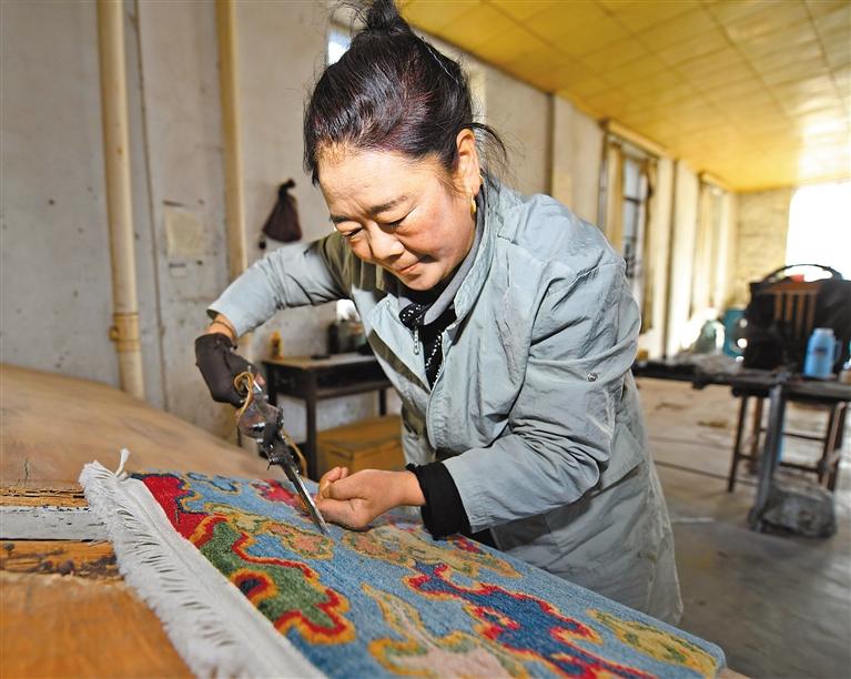 左圖為(wei) 拉薩喀瓦堅手工藏毯公司工人對藏毯進行立體(ti) 裁剪。 記者 唐斌 攝