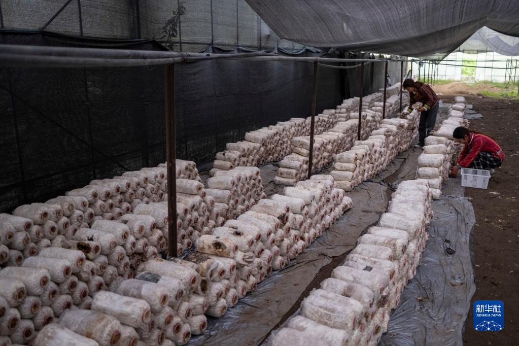 姐姐次仁拉珍(左)和妹妹明珠措姆在采摘平菇(4月14日攝)。