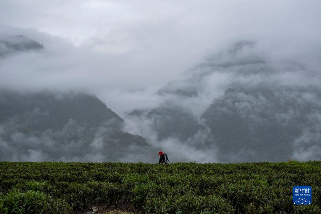 門巴族姑娘貢桑拉姆正在雲(yun) 霧繚繞的茶園裏采摘茶青