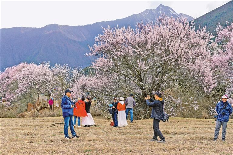 圖為(wei) 遊客在米林縣索鬆村拍照留影。記者 格桑吉美 攝