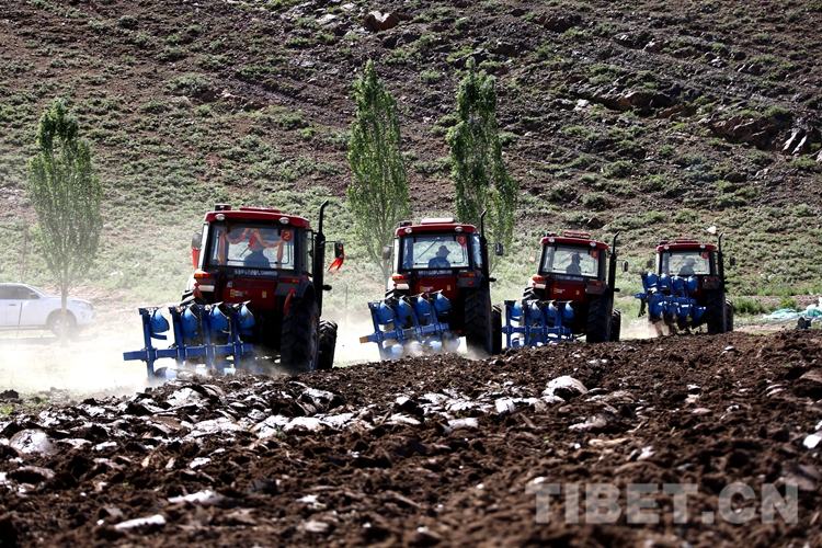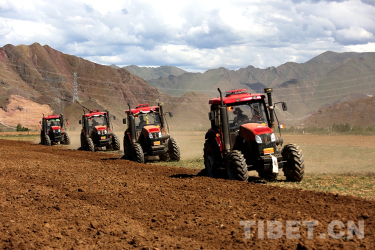 圖為(wei) 在曲嘎強村四台農(nong) 用機械聯合作業(ye) 耕種飼草 攝影:王佳豪