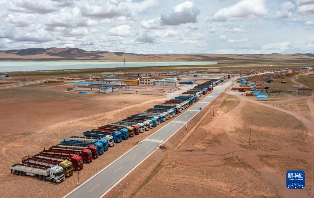 在雙湖縣多瑪鄉(xiang) 拍攝的負責運送搬遷群眾(zhong) 家具的貨車(7月12日攝,無人機照片)。新華社記者 孫非 攝