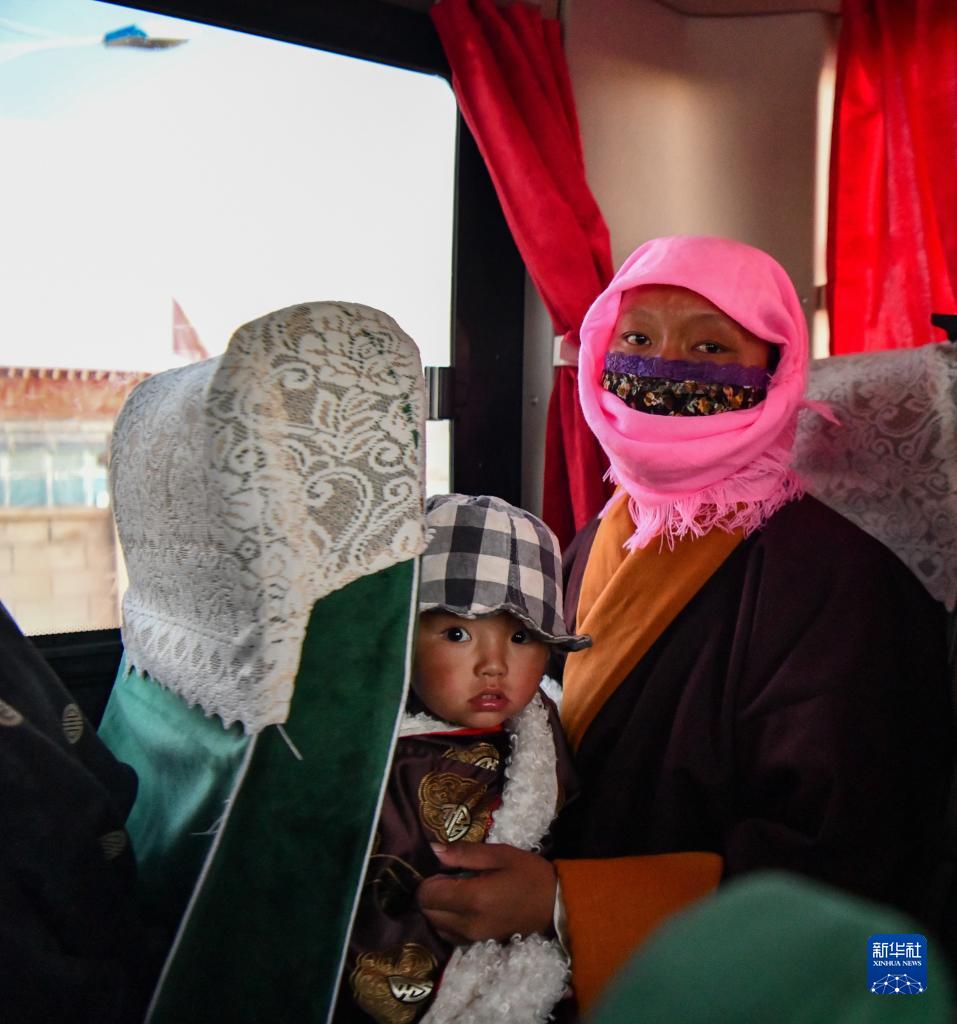 雙湖縣多瑪鄉(xiang) 果根擦曲村牧民次仁央金(右)乘坐大巴,準備前往森布日安置點(7月19日攝)。新華社記者 晉美多吉 攝