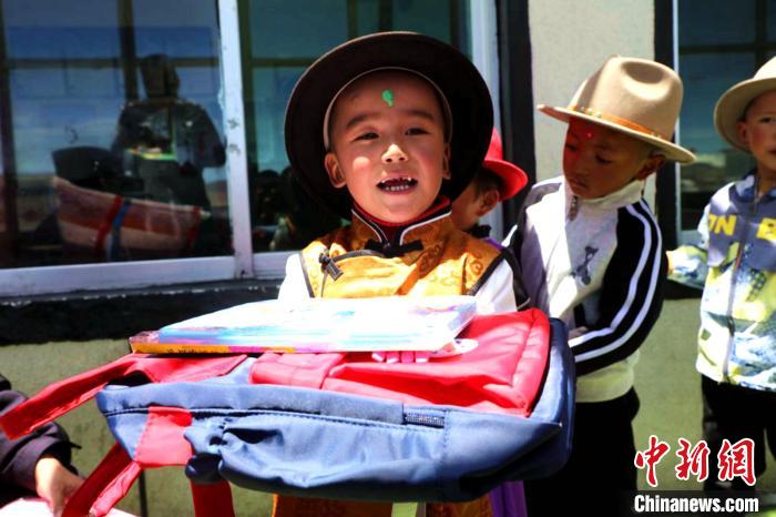 圖為(wei) 普瑪江塘鄉(xiang) 小學生領取書(shu) 包等學習(xi) 用具。 浪卡子縣網信辦供圖