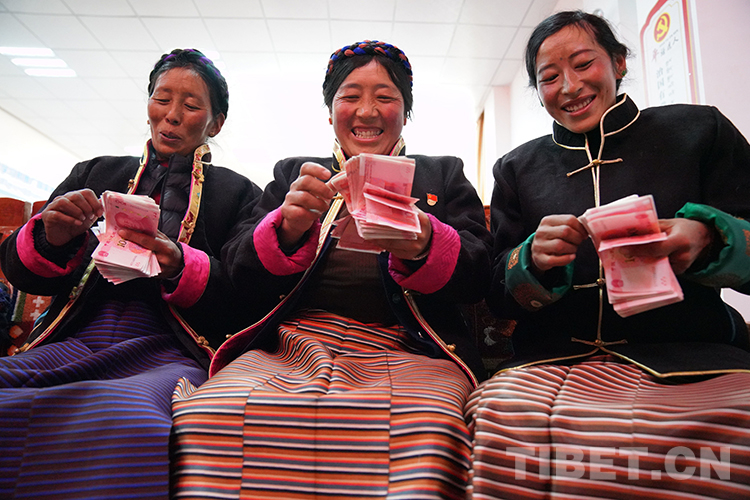 圖為(wei) 領到工資的部分放牧員家屬正在數錢。攝影:曲傑