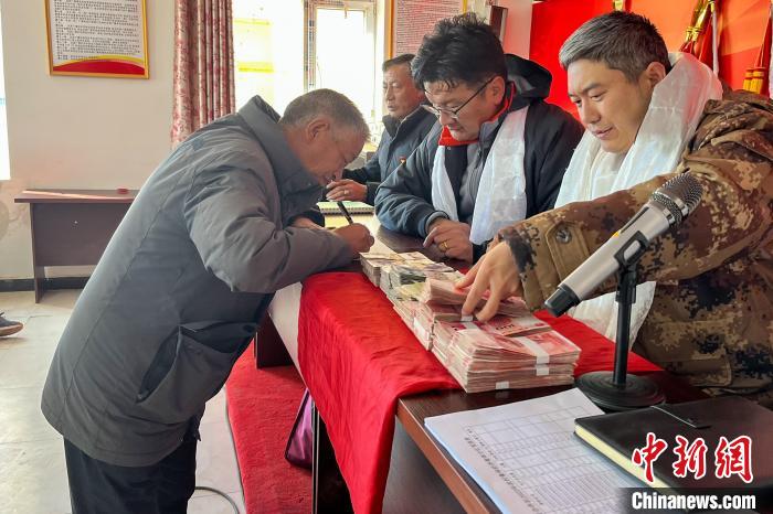 圖為(wei) 2月19日,西藏那曲安多縣帕那鎮申格卡崗村牧民分紅。 中國鐵路青藏集團有限公司 供圖