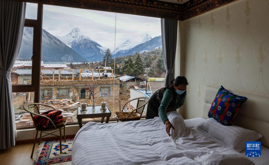 央金措姆在自己家的民宿中打掃房間,窗外是湖光山色(3月19日攝)。新華社記者薑帆 攝