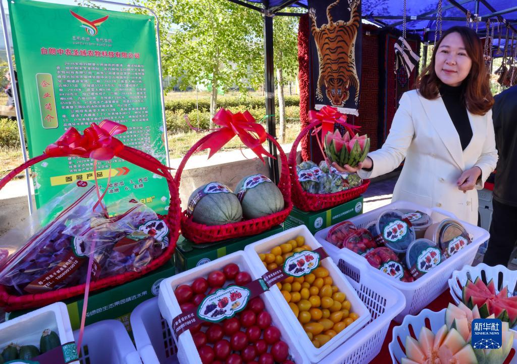 5月28日,珠峰博覽園的工作人員在第十屆白朗果蔬采摘節上展示自產(chan) 的蔬菜、水果。新華社記者 薑帆 攝