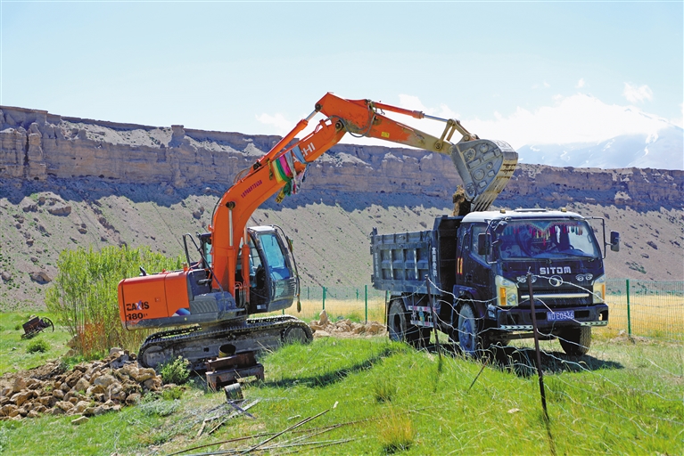 普蘭(lan) 縣普蘭(lan) 鎮仁貢村孔雀施工隊的機械車輛在施工,當地群眾(zhong) 在普蘭(lan) 縣普蘭(lan) 鎮施工隊務工,一天可增收230元。記者 溫凱 攝