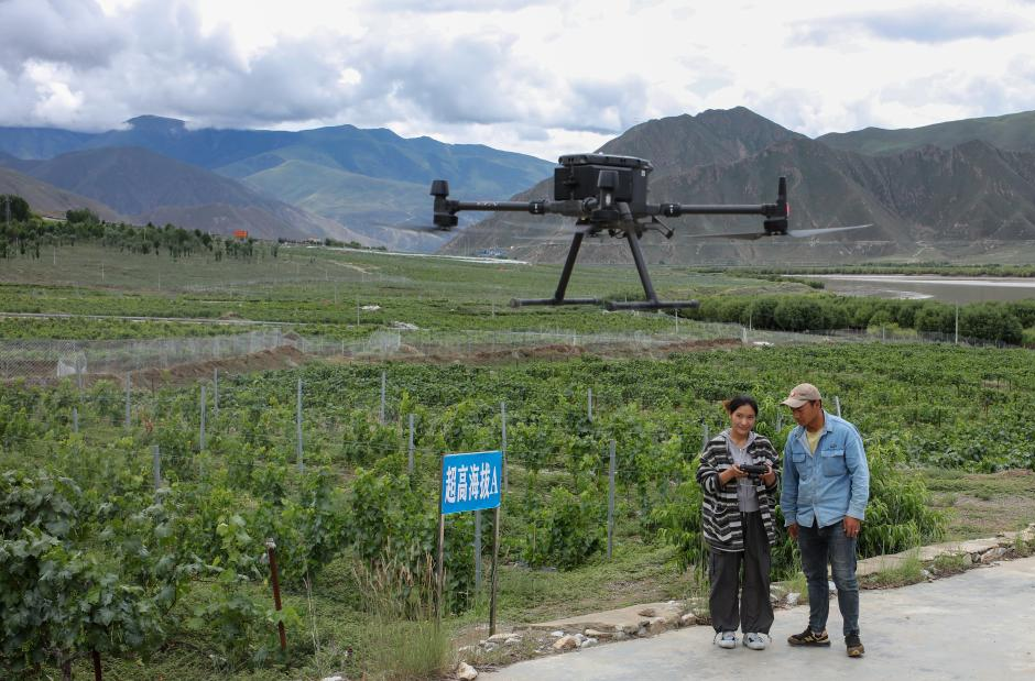 7月26日,桑日縣一家葡萄酒企業的員工曲珍(左)在葡萄園裏向技術員何誌榮學習使用農用無人機。[詳細]