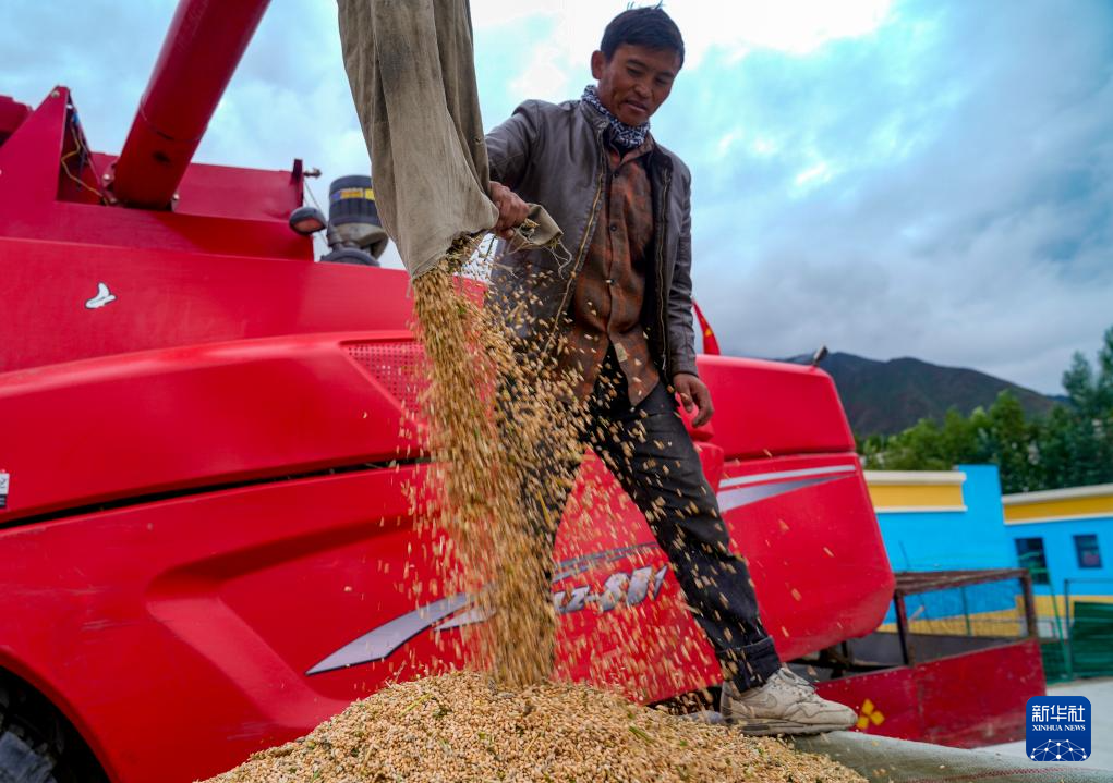 8月24日,乃東(dong) 區的農(nong) 民在用聯合收割機收獲青稞。新華社記者 薑帆 攝