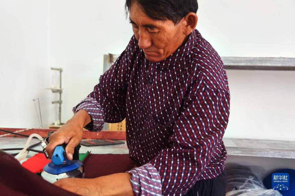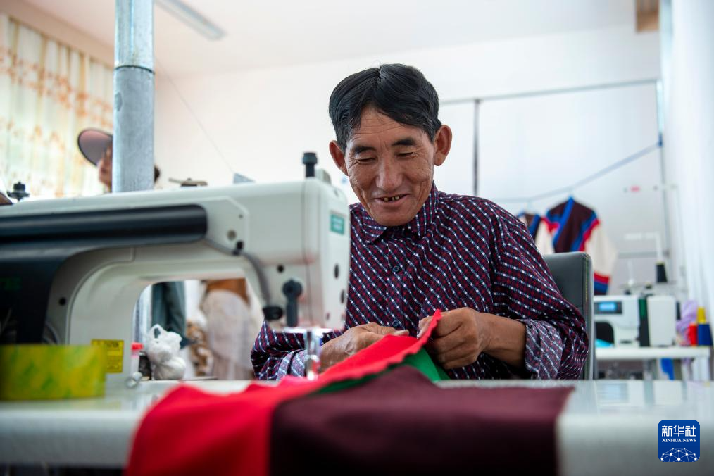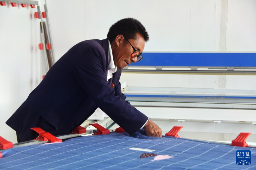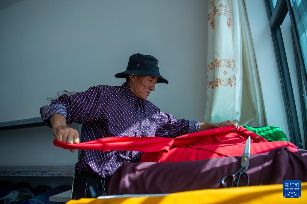 一位村民在裁剪布料(8月24日攝)。新華社發(旦增努布 攝)