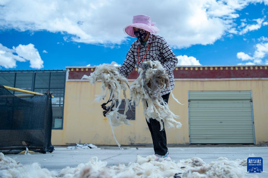 一位村民在晾曬羊毛(8月24日攝)。新華社發(旦增努布 攝)