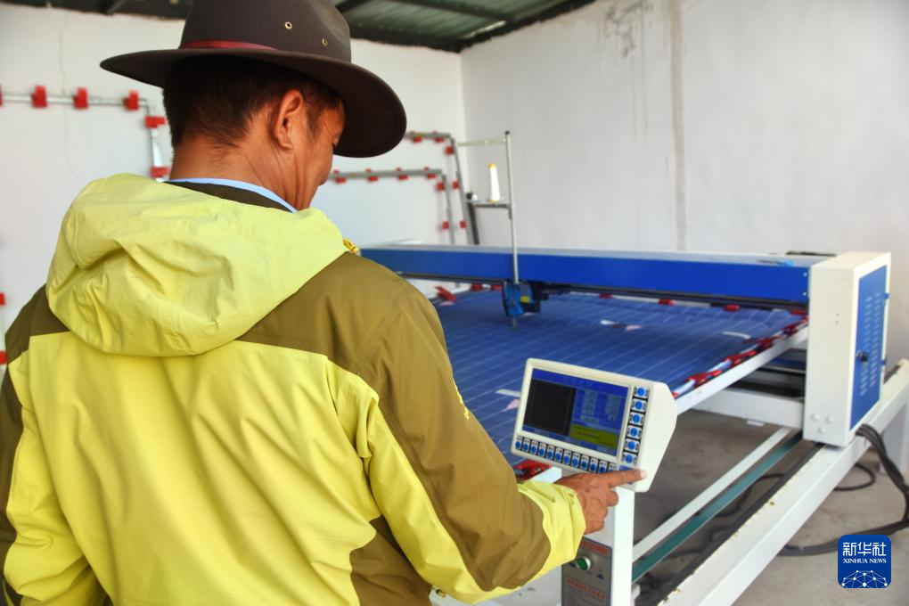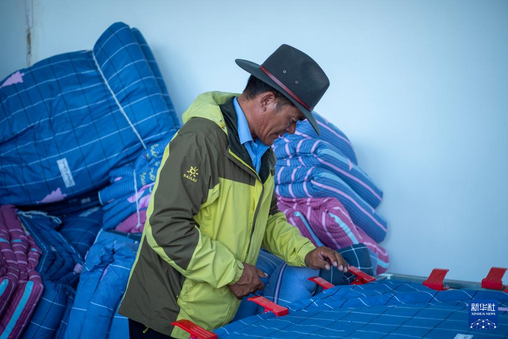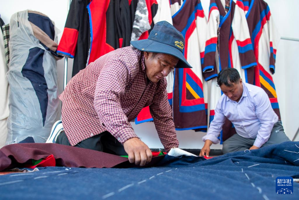 一位村民在縫製羊毛被(8月24日攝)。新華社發(旦增努布 攝)