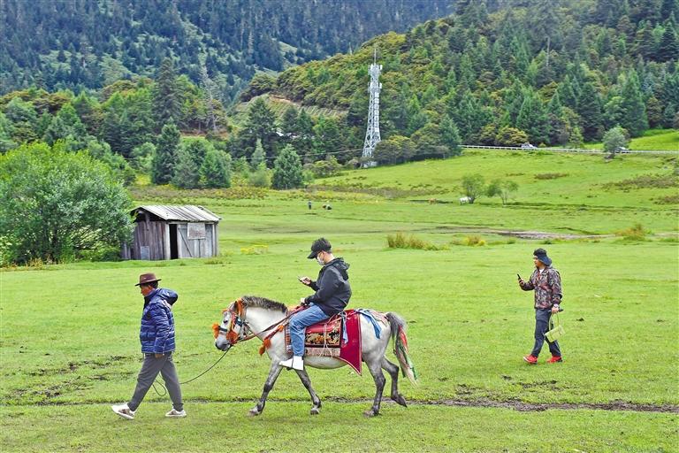 在平措大叔家庭旅館內(nei) 住宿的遊客體(ti) 驗騎馬。 記者 張猛 攝