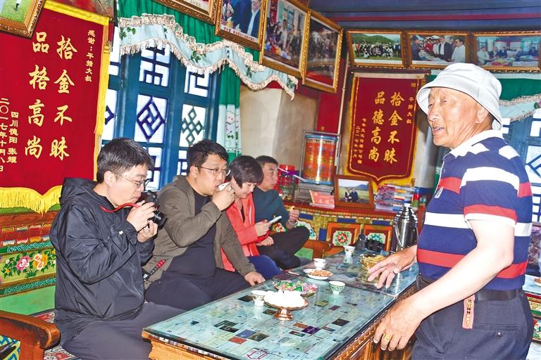 平措在家庭旅館內(nei) 招待北京來的遊客。 記者 張猛 攝