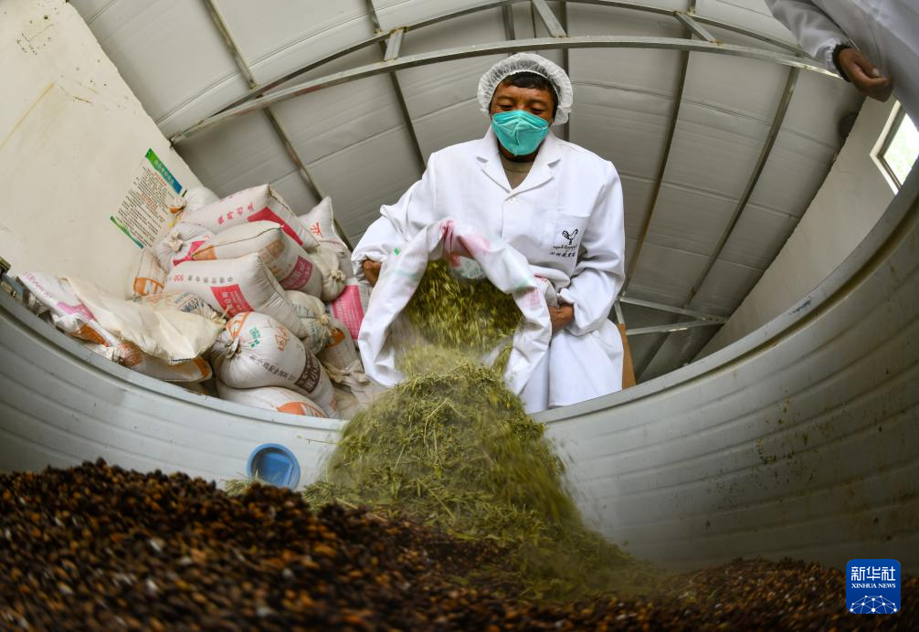 9月24日,合作社工作人員製作雞飼料。新華社記者 晉美多吉 攝