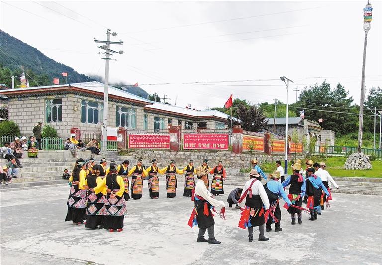 日喀則市吉隆縣達曼村群眾(zhong) 在村廣場上載歌載舞。記者 李洲 攝