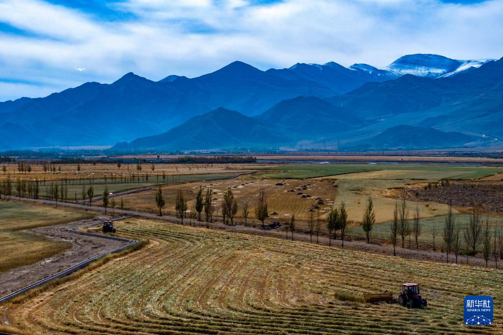 10月24日,村民駕駛農機在拉薩市林周縣強嘎鄉曲嘎強村將收割過的牧草打包(無人機照片)。[詳細]