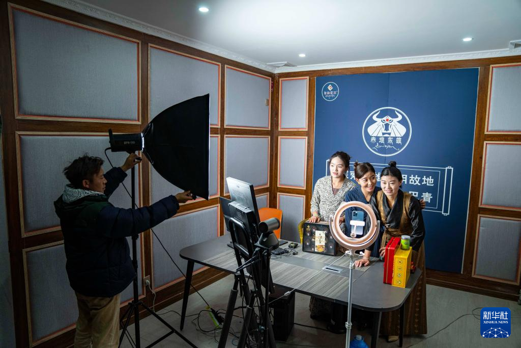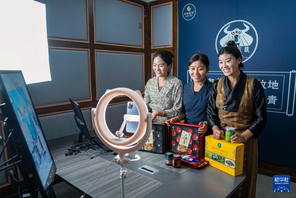 網絡主播在巴青縣“赤堆東(dong) 雄”網紅直播間推介當地特色農(nong) 牧產(chan) 品(10月29日攝)。新華社記者 孫非 攝