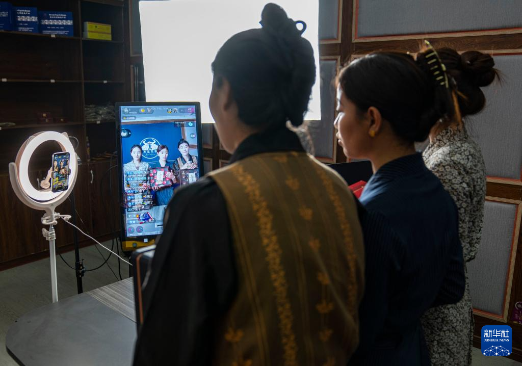 主播朗貢旺姆(右)和普麽(me) 在巴青縣“赤堆東(dong) 雄”網紅直播間挑選商品(10月29日攝)。新華社記者 孫非 攝