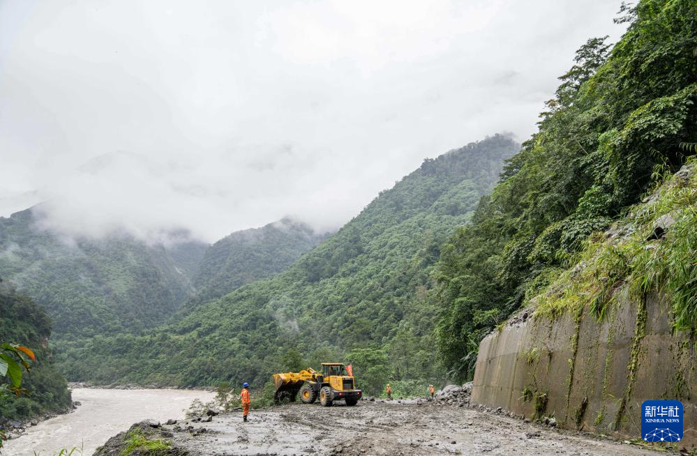 在墨脫縣格當鄉(xiang) ,工作人員在搶通道路(2023年10月12日攝)。新華社記者 孫非 攝