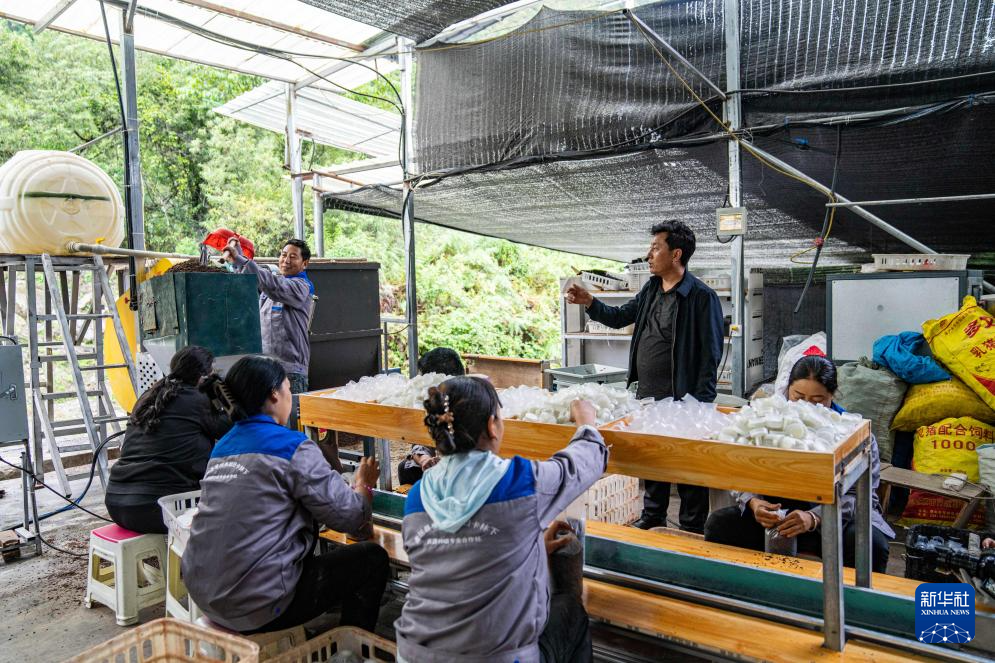 在墨脫縣格當鄉(xiang) 尼日卡林下資源種植合作社,貢秋次仁(右二)指揮工人生產(chan) 菌包(2023年10月12日攝)。新華社記者 孫非 攝
