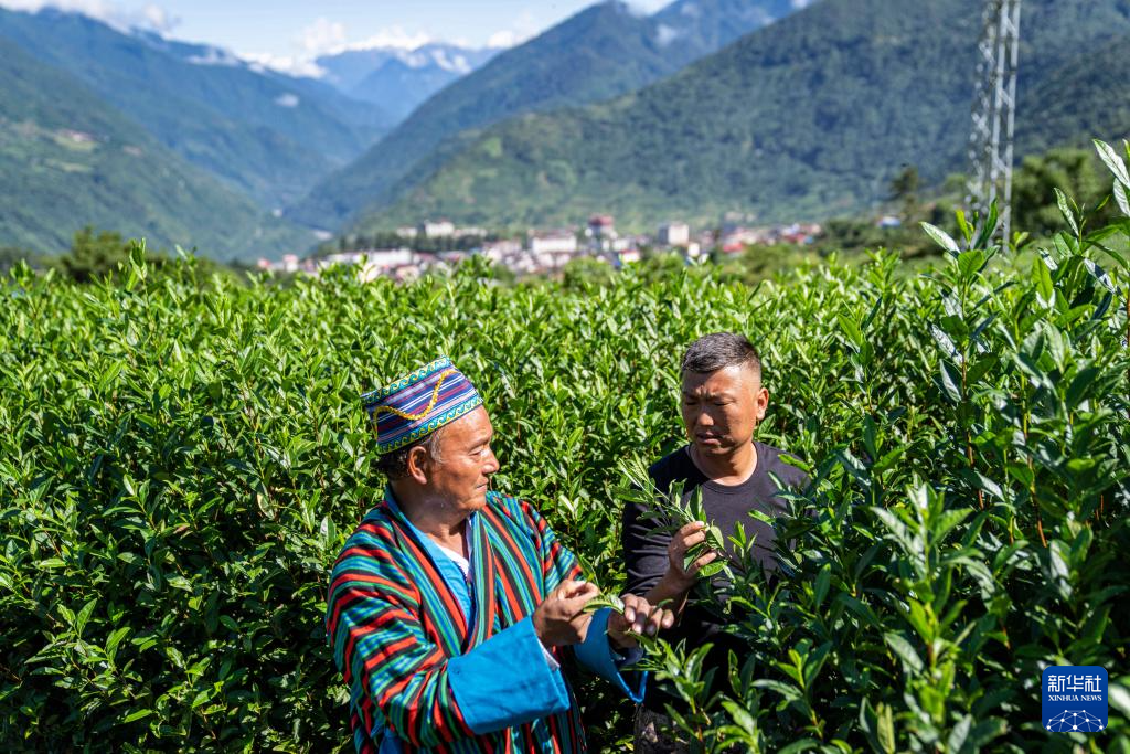 墨脫村村委會(hui) 副主任達瓦次仁(右)查看茶葉生長情況(2023年10月13日攝)。新華社記者 孫非 攝