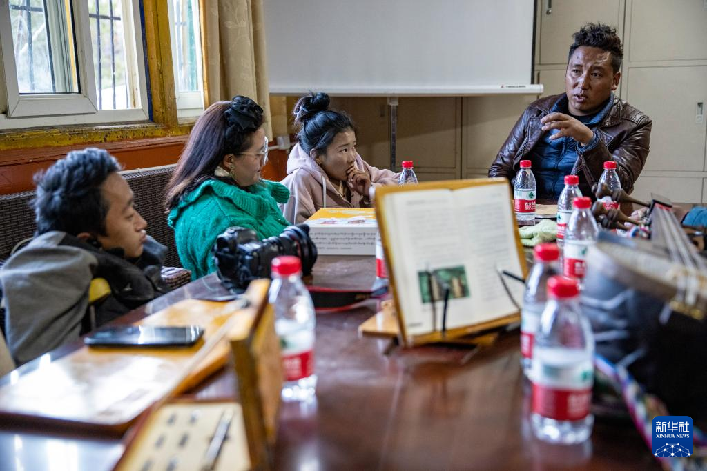 西藏拓崗文化傳(chuan) 播有限公司主播邊桑在直播銷售西藏傳(chuan) 統樂(le) 器紮念琴(11月10日攝)。新華社記者 薑帆 攝