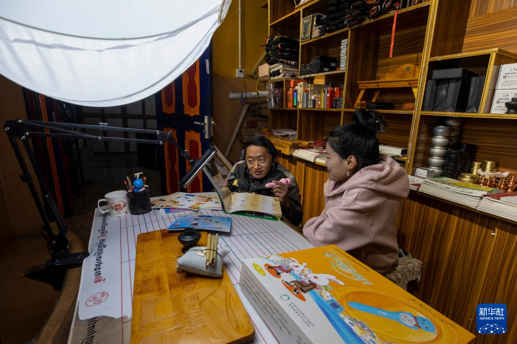 西藏拓崗文化傳(chuan) 播有限公司員工拉巴頓珠(左)與(yu) 主播索朗德吉合作直播銷售藏語學習(xi) 文具(11月10日攝)。新華社記者 薑帆 攝