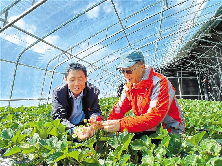 圖為(wei) 基地蔬菜種植技術人員孟德利(左)與(yu) 駐村幹部一起查看草莓長勢。記者 汪純 攝