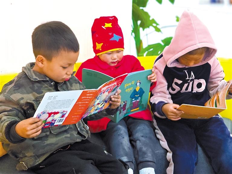 紮拉村的孩子在新時代文明實踐誌願服務隊成員的輔導下閱讀藏文繪本。