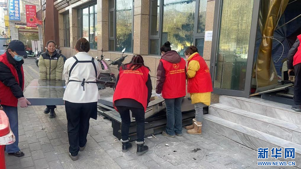 在西藏拉薩市功德林街道幸福社區,誌願者正在協助商戶處理建築垃圾(12月3日攝)。新華社發(娜拉 攝)