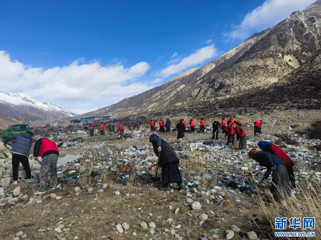 在西藏昌都市八宿縣然烏(wu) 鎮然那村,群眾(zhong) 們(men) 正在參與(yu) 環境衛生整治活動(12月6日攝)。新華社發(土登念紮 攝)