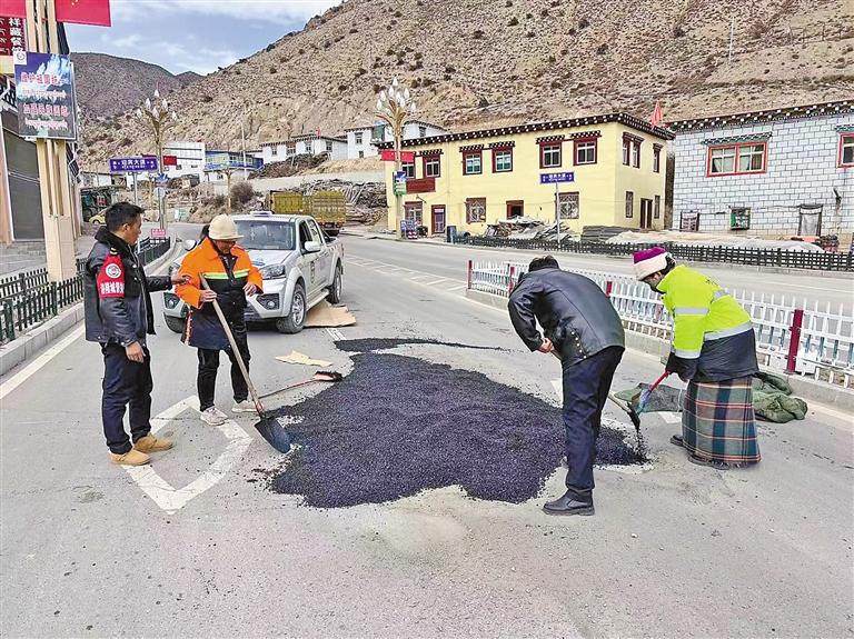 圖為(wei) 洛隆縣組織公路養(yang) 護段開展路麵修複工作。記者 貢秋曲措 攝