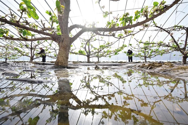 河北省灤州市茨榆坨鎮的果農(nong) 在大棚內(nei) 給櫻桃樹疏花。