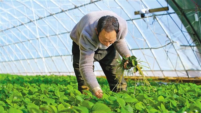 圖為(wei) 吞彌現代農(nong) 業(ye) 產(chan) 業(ye) 園種植人員在草莓種植大棚內(nei) 除雜草。記者 鹿麗(li) 娟 攝