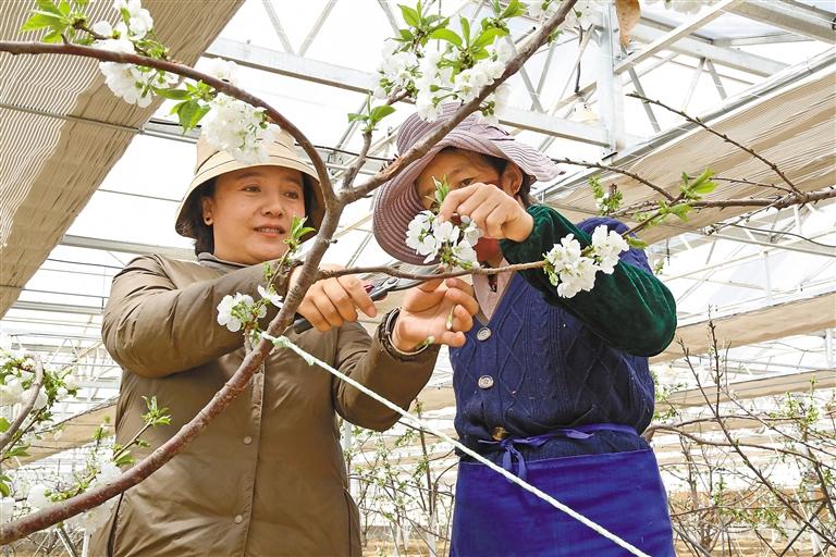 圖為(wei) 尼木縣“點對點”幹部德吉(左一)向群眾(zhong) 傳(chuan) 授車厘子種植技術。(圖片由中共尼木縣委宣傳(chuan) 部提供)