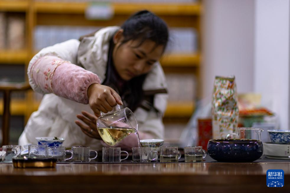 墨脫縣背崩鄉(xiang) 格林村村民袁美華在村裏的特產(chan) 銷售部給遊客泡茶(4月24日攝)。新華社記者 薑帆 攝