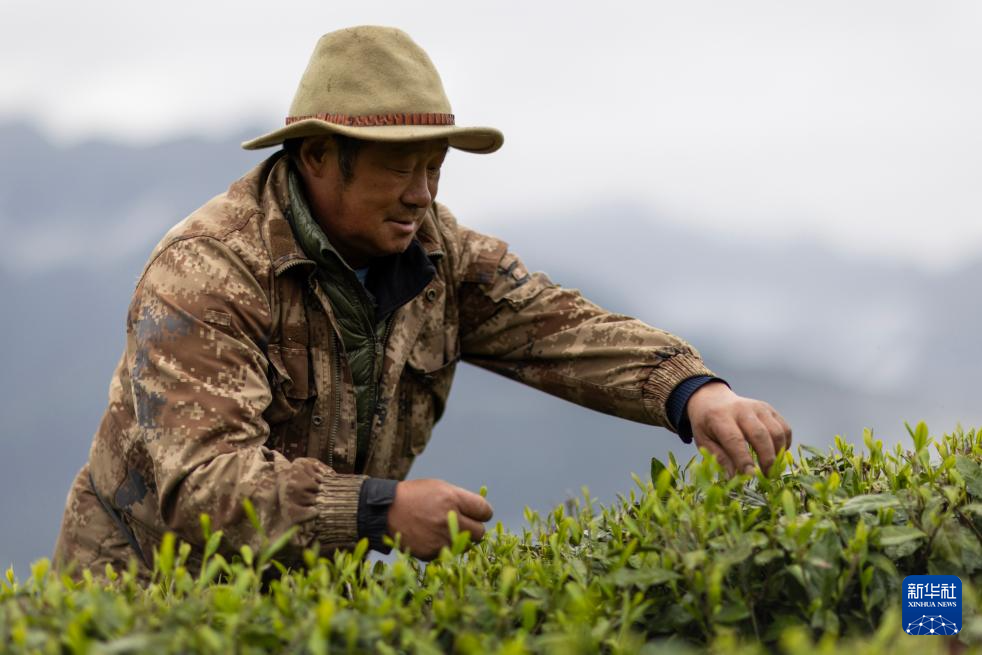 墨脫縣背崩鄉(xiang) 格林村村民登巴紮巴在茶園中采茶(4月24日攝)。新華社記者 薑帆 攝