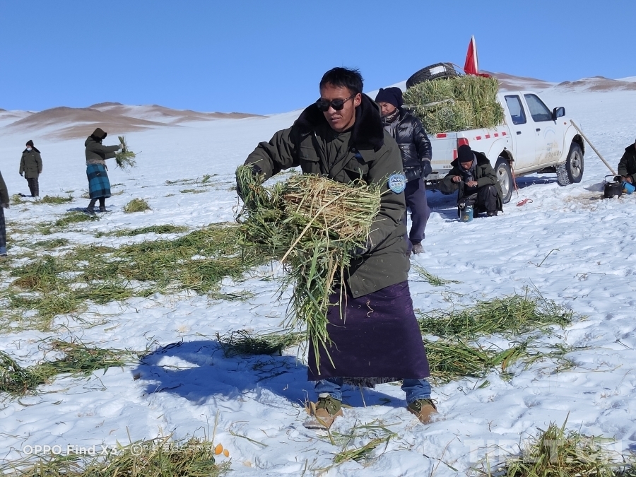 圖為(wei) 讚康管理站站長邊巴給野生動物放草(邊巴供圖)