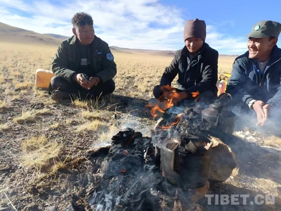 圖為(wei) 麻木卓瑪管理站站長洛達和同事們(men) 在外巡護(洛達為(wei) 右一)