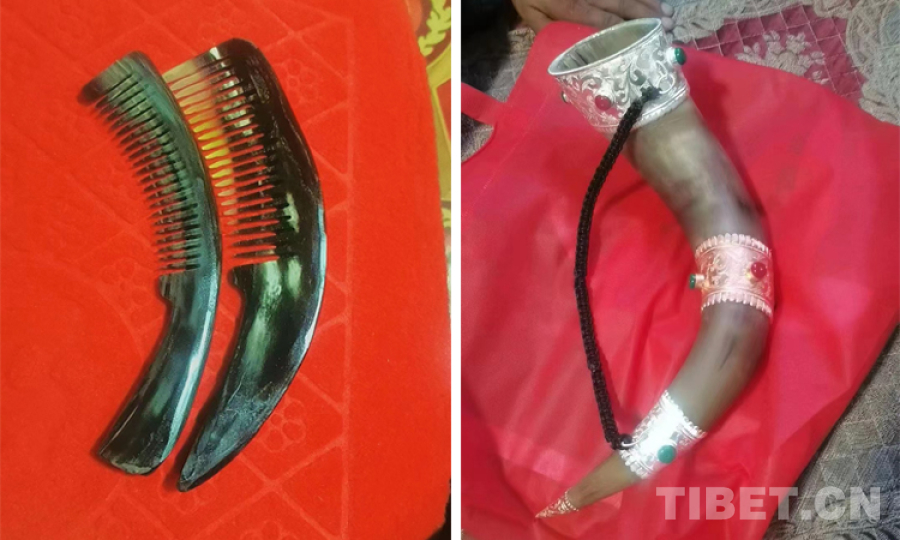 圖為(wei) 麻木卓瑪管理站站長洛達用犛牛角製作的梳子和酒器 (洛達供圖)