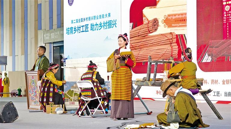 在鄉(xiang) 村工匠技能技藝展示交流中,西藏工匠代表在展示自己的作品。 記者 次仁片多 琅珍 攝