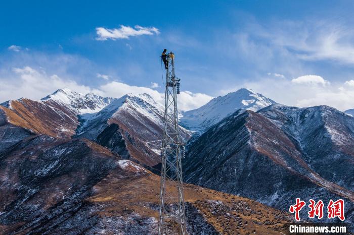 2023年11月30日,西藏索縣榮布至丁青縣巴達35千伏線路工程施工人員正在開展塔上作業(ye) 。趙清鵬 攝