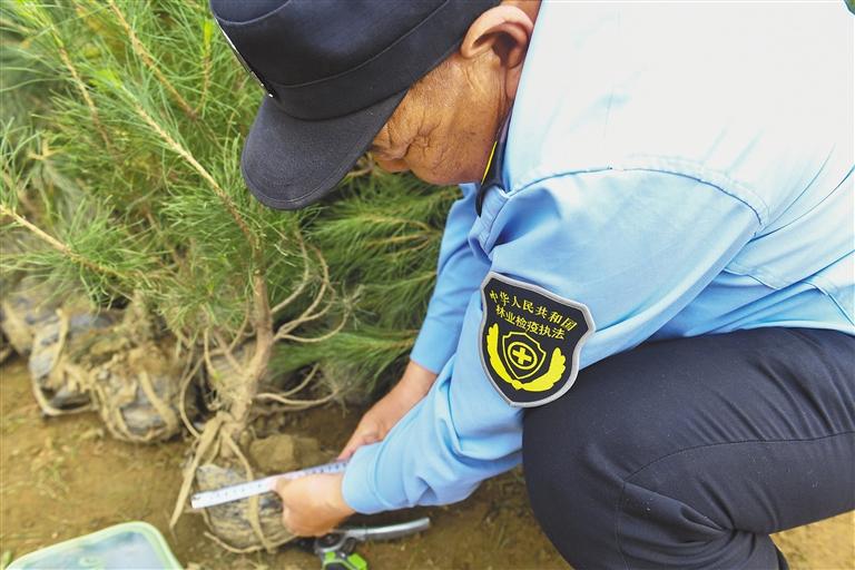 在拉薩南北山綠化工程2024年度鞏固提升(貢嘎機場周邊山體(ti) )工程項目上,林業(ye) 檢疫執法工作人員在檢查樹苗根部土球是否達標。 新華社記者 晉美多吉 攝