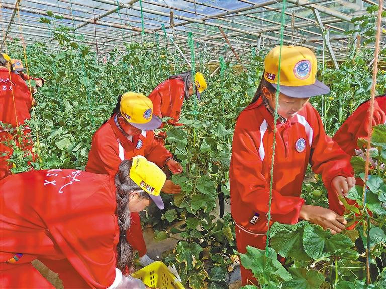 鞍山市援建的巴青縣中學勤工儉(jian) 學實踐基地內(nei) ,學生在采摘。