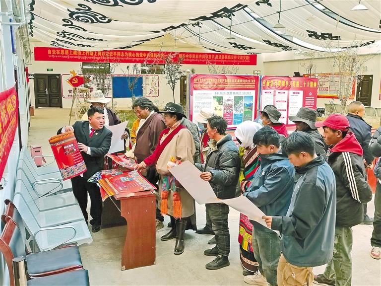 那曲市雙湖縣措折羅瑪鎮第三屆“鄉(xiang) 村振興(xing) 那曲奮進”活動中,法庭幹警(左一)向群眾(zhong) 進行普法宣傳(chuan) 。