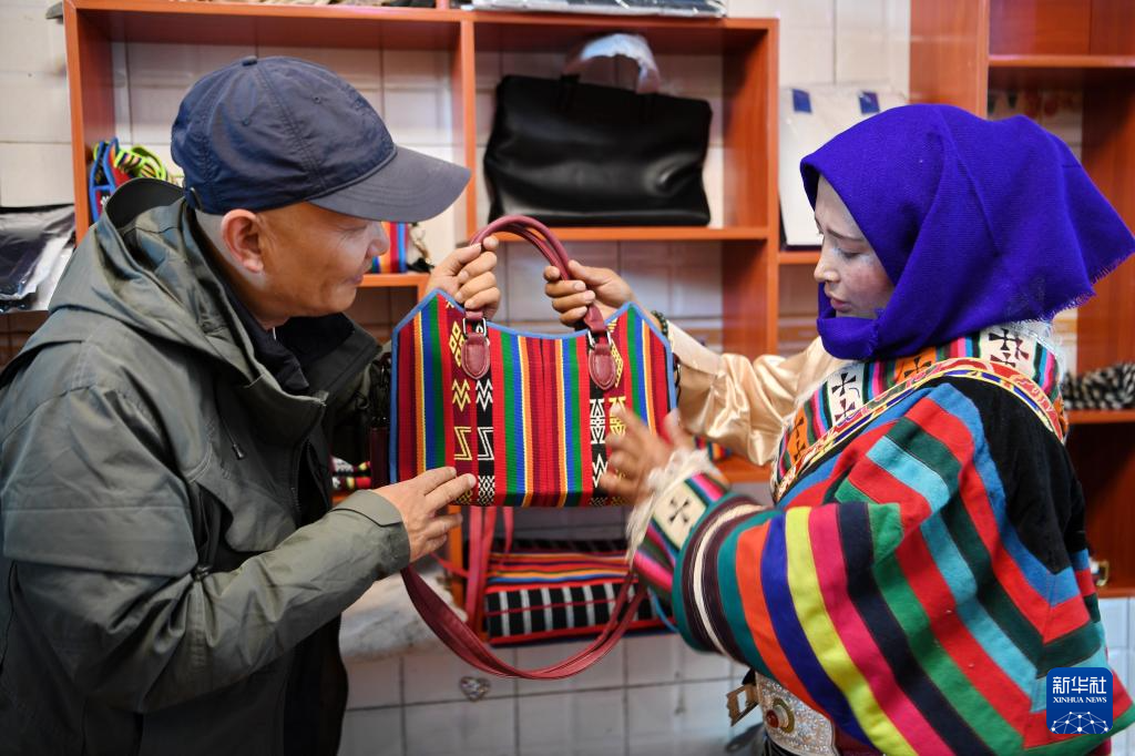 一名來自上海的遊客(左)在安多托尕爾倉(cang) 遊牧產(chan) 業(ye) 有限責任公司展廳挑選產(chan) 品(8月24日攝)。新華社記者 張汝鋒 攝