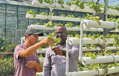 中國援多米尼克農(nong) 業(ye) 技術合作項目始於(yu) 2005年,目前已開展至第八期。項目引進了多個(ge) 高附加值農(nong) 作物品種,促進了多米尼克農(nong) 業(ye) 產(chan) 業(ye) 升級。圖為(wei) 中多兩(liang) 國農(nong) 業(ye) 專(zhuan) 家在觀察水培係統種苗生長情況。
